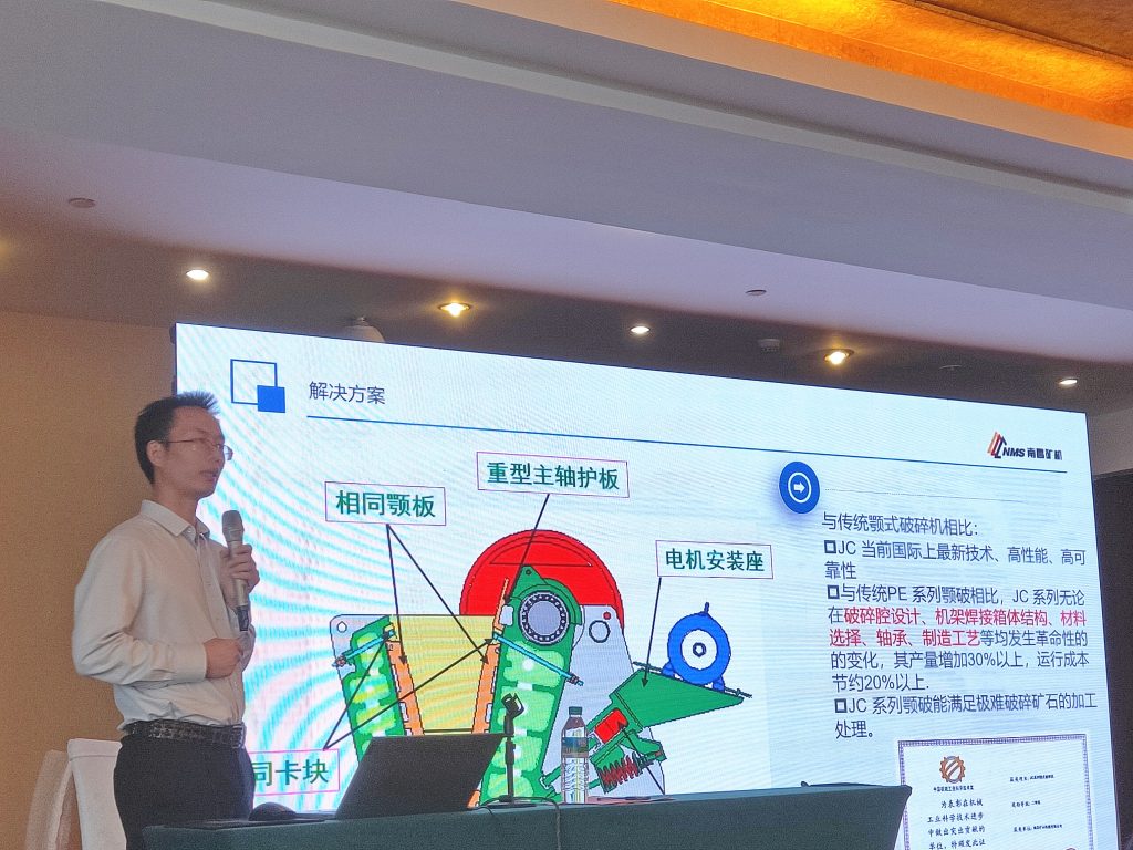會(huì)上,南昌礦機(jī)研發(fā)中心總監(jiān)詹春生發(fā)表了題為《大型化短流程碎礦工藝技術(shù)》的演講。演講提到,隨著礦石的持續(xù)開(kāi)采,品位越來(lái)越低,人工成本越來(lái)越高,為降低能耗,減少運(yùn)營(yíng)成本,維持盈利,市場(chǎng)對(duì)于性能穩(wěn)定、操作簡(jiǎn)單、維護(hù)方便的大型化、大破碎比、智能化裝備的需求越來(lái)越明顯。在打造綠色礦山、智能礦山的大趨勢(shì)下,要實(shí)現(xiàn)節(jié)能環(huán)保高效,優(yōu)化流程是關(guān)鍵。南昌礦機(jī)使用先進(jìn)流程軟件設(shè)計(jì)出的流程精準(zhǔn)、快捷,搭配上南昌礦機(jī)擁有大破碎比、高篩分效率、高處理量特點(diǎn)的大型化裝備,可實(shí)現(xiàn)短流程優(yōu)化的目的。